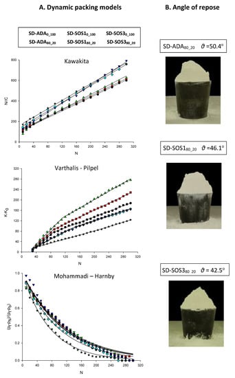 In Figure 7A, plots representing the three dynamic packing models are presented. In the Kawakita plots, the points fall in straight lines, confirming model linearity. The lines form two groups. One group consisted of EO powders prepared with PSC only (SD-ADA0_100, SD-SOS10_100, and SD-SOS30_100) with parameter ‘a’ values between 0.54 and 0.57, and a second group consisted of PLM/PSC batches (SD-ADA80_20, SD-SOS180_20, and SD-SOS380_20), with lower ‘a’ values between 0.46 and 0.48 indicating better packing ability.