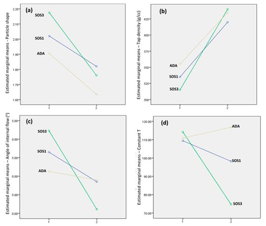 Furthermore, considering the values of the model parameters Kawakita a, AIF, and T in Table 4, it seems that for the PLM/PSC EO powders, AIF and T follow the same decreasing order: SD-ADA80_20 > SD-SOS180_20 > SD-SOS380_20. To elucidate and compare the effects of the type of microencapsulating wall (PSC or PLM/PSC) and type of starch (ADA, SOS1, SOS3) on AIF and T, statistical analysis was performed using a factorial experimental design of two factors: type of microencapsulating wall (two levels: PSC, PLM/PSC) and type of starch (three levels: ADA, SOS1, and SOS3) (General Linear Model, SPSS 20.0). Further information of the statistical analysis can be found elsewhere [47]. Significant interactions were found for the effects of the two factors on both dynamic packing parameters and also on particle shape and tap density. Interaction plots are depicted in Figure 8, where it can be seen that it is the SD-SOS380_20 batch (green line) that exhibits the largest drop in the values of the measured properties compared to the other starch batches ADA and SOS1, causing the statistical interaction (for particle shape significance, p = 0.015; for tap density, p = 0.003; for AIF, p = 0.001; and for constant T, p = 0.011). This means that the incorporation of starch SD-SOS380_20 makes the presence of Eudragit L100 more effective in altering the packing properties of the spray-dried products. From the above results, it becomes clear that the presence of the polymer in the encapsulating wall, and especially together with the surface active low viscosity starch grade SD-SOS3 results in great improvement of the packing ability of the spray-dried powders, which is very important for further processing.