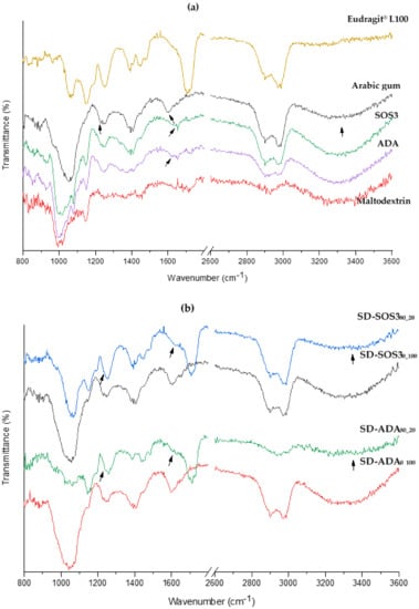 FTIR spectra of encapsulating wall materials (a) and spray-dried products (b) prepared from emulsions stabilized with polysaccharides only (subscript 0_100) or polymer/polysaccharides 80/20 (subscript 80_20) with modified starches ADA (SD-ADA0_100, SD-ADA80_20) and SOS3 (SD-SOS30-100, SD-SOS380_20).