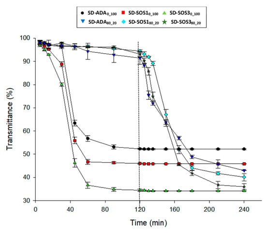 Reconstitution of a dry emulsion upon contact with liquid into its original oil/water emulsion is an important step before releasing the encapsulated ingredient [5,32]. This is because the formation of numerous droplets provides a very large surface in contact with the liquid so that if the encapsulating wall does not pose a barrier to the penetration of water, release takes place. In Figure 10, plots of transmittance of reconstitution medium versus time are presented for the spray-dried products. A rapid decrease of the percentage of transmittance is seen in the pH 1.2 medium for the PSC products during the first 60 min, indicating re-emulsification. Although the drop is similar for the products of the three starch grades, the final transmittance is greater for ADA (53%) followed by SOS1 (47%) and SOS (34%). This sequence should reflect the number of finally formed droplets. The surface-active grades SOS are able to reduce the oil/water interfacial tension and produce finer dispersions or a greater number of droplets. Alternatively, these differences may have been caused by the differences in oil retention, although these were rather small. Between the two SOS grades, the lower viscosity SOS3 grade shows a markedly lower final percentage of transmittance. On the other hand, PLM/PSC products show a negligible transmittance change at pH 1.2. This is explained by the domination of the encapsulating wall by the polymer molecules present at a greater ratio of 80/20, which inhibits the contact of the medium with the PSC components. However, when the pH of the medium was changed to 6.8%, transmittance dropped in a similar manner with the drop in the corresponding PSC products at pH 1.2, indicating access of the liquid to PSC and reconstitution. Again, the finally achieved transmittance followed the same sequence of the corresponding PSC products, i.e., SD-ADA80-20 > SD-SOS180-20 > SD-SOS380_20.