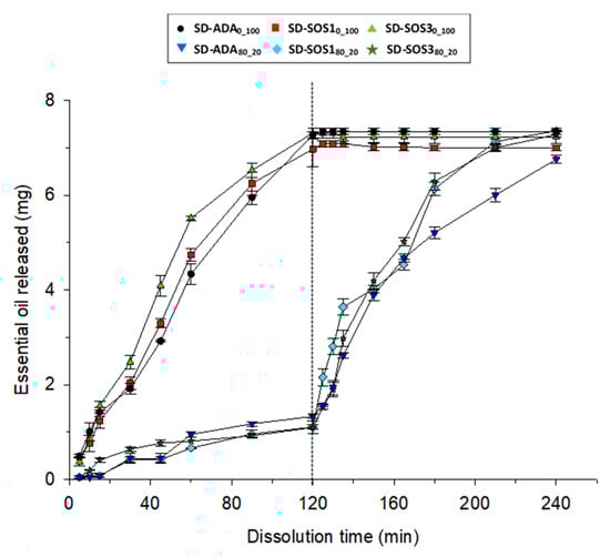 In Figure 11, the release profiles of EO from the six experimental spray-dried products are presented. The dialysis membrane method was used for testing, for the first 120 min at pH 1.2, after which it changed to 6.8 by the addition of sodium phosphate. This method is useful for testing systems where the release of colloidal particles interferes with EO analysis. The method has been criticized for leading to the misinterpretation of release kinetics mainly of lipophilic drugs due to reversible binding [51,52]. However, in the present work, the passage of EO across the dialysis membrane into the dissolution medium is not expected to be significantly affected by the presence of the membrane because of the hydrophilic nature and low molecular weight of the EO ingredients (i.e., Carvacrol MW = 155.22, p-Cymene MW = 139.21, γ-Terpinene MW = 136.23, and Thymol MW = 150.22).