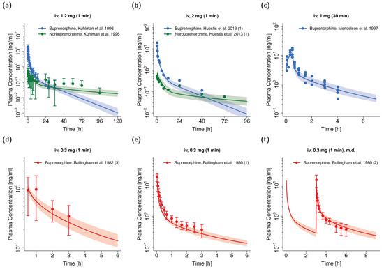 Buprenorphine (blue: venous blood, red: arterial blood) and norbuprenorphine (green: venous blood) predicted and observed plasma concentration-time profiles after intravenous administration of buprenorphine in adults. (a,b): selection of internal training dataset, (c–f): selection of external test dataset. Population simulations (n = 100) are shown as lines with shaded areas. Observed data are shown as circles ± standard deviation if available. References with numbers in parentheses link to a specific observed dataset described in the study table (Table 1). Predicted and observed area under the concentration-time curve from the first to the last data point (AUClast) and maximum plasma concentration (Cmax) values are compared in Table S6 of the Supplementary Materials. Predicted and observed plasma concentration-time profiles of all studies in adults are shown in Section 4.1 of the Supplementary Materials both on a linear and a semilogarithmic scale. iv: intravenous, m.d.: multiple dose.