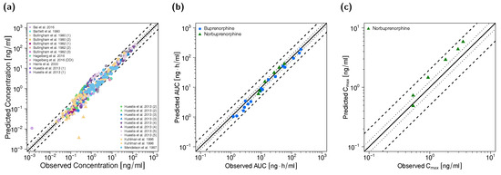 Predicted versus observed plasma concentrations (a) as well as predicted versus observed AUClast (b) and Cmax (c) values of buprenorphine and norbuprenorphine for the adult PBPK model. In (a), each symbol represents a single plasma concentration (circles: buprenorphine, triangles: norbuprenorphine). In (b,c), each symbol represents the AUClast or Cmax of a single plasma concentration-time profile (blue circles: buprenorphine, green triangles: norbuprenorphine). As stated in the materials and methods section, Cmax values were only calculated for long-term infusions and norbuprenorphine metabolite. The black solid lines mark the lines of identity. Black dotted lines indicate 1.25-fold, black dashed lines indicate 2-fold deviation. AUClast: area under the plasma concentration-time curve from the first to the last data point, Cmax: maximum plasma concentration.