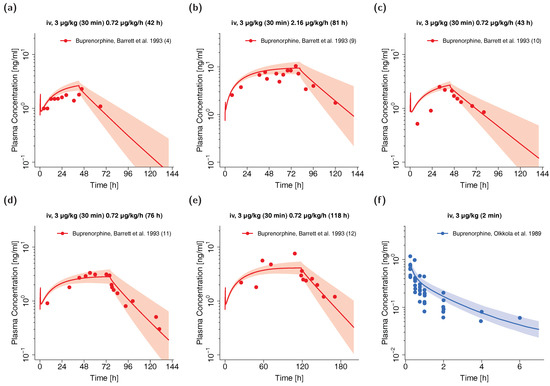 Buprenorphine (red: arterial blood, blue: venous blood) predicted and observed plasma concentration-time profiles after intravenous administration of buprenorphine in preterm neonates (a–e) and children (f). Population simulations (n = 100) are shown as lines with shaded areas. Observed data are shown as circles. References with numbers in parentheses link to a specific observed dataset described in Table 1 and Table S2 of the Supplementary Materials. Predicted and observed area under the plasma concentration-time curve from the first to the last data point (AUClast) and maximum plasma concentration (Cmax) values are compared in Table S6 of the Supplementary Materials. Predicted and observed plasma concentration-time profiles of all studies in pediatrics are shown in Section 4.2 of the Supplementary Materials both on a linear and a semilogarithmic scale. iv: intravenous.