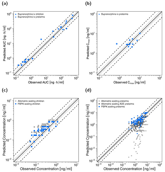 Predicted versus observed AUClast (a) and Cmax (b) values of buprenorphine for the pediatric PBPK models as well as predicted versus observed plasma concentrations for children (c) (blue: PBPK modeling, grey: allometric scaling) and preterm neonates (d) (blue: PBPK modeling, grey: allometric scaling, dark grey: allometric scaling with ADE as suggested by Mahmood and Tegenge [69]). In (a,b), each symbol represents the AUClast or Cmax of a single concentration-time profile. In (c,d), each symbol represents a single plasma concentration. As stated in the materials and methods section, Cmax values were only calculated for long-term infusions. The black solid lines mark the lines of identity. Black dotted lines indicate 1.25-fold, black dashed lines indicate 2-fold deviation. ADE: age-dependent exponent, AUClast: area under the plasma concentration-time curve from the first to the last data point, Cmax: maximum plasma concentration.