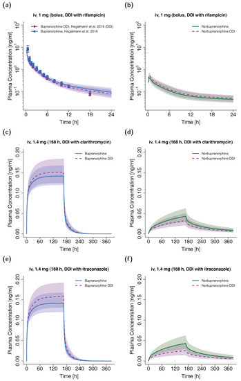 The DDI effects were evaluated by comparing plasma concentration-time profiles of buprenorphine and norbuprenorphine after buprenorphine administration alone (control) and plasma profiles during concomitant use with the DDI perpetrator (inhibition/induction). Additionally, the corresponding predicted AUC ratios (AUCinhibition/induction, predicted/AUCcontrol, predicted) were calculated. Since observed data of a DDI clinical trial with rifampicin was available, the AUC ratio predicted was also compared to the AUC ratio observed in the respective DDI study.