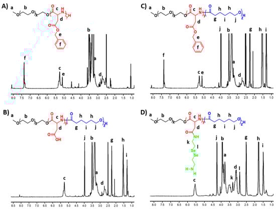 The synthesis of the mPEG-P(LA-DSeDEA)-PCL copolymer with pendant selenocystamine moiety involves ROP reaction, hydrolysis reaction and EDC/NHS click chemistry. ROP reaction of N-carboxy anhydrides can be initiated by either mPEG-NH2 or mPEG-OH. Most commonly, mPEG-NH2 was used as a macro-initiator owing to fast reaction kinetics leading to controlled polymerization and well-defined products. However, multistep and complex synthetic procedures make the mPEG-NH2 macro-initiator more expensive than mPEG-OH [50,51]. In this study, we used mPEG-OH as a macro-initiator for ROP reaction of BLA-NCA in the presence of a catalytic amount of Sn(Oct)2 to synthesize the polypeptide mPEG-PBLA. For this purpose, we first cyclized β-benzyl-l-aspartic acid by treating it with triphosgene in THF [39]. As shown in Figure S1, the peaks at δ 2.85, 5.10, 5.24, and 7.31 ppm were assigned to –COCH2CH, –CH2CH(CO)NH–, –OCH2C6H5, and –C6H5 protons, respectively, which confirmed the successful synthesis of BLA-NCA. When BLA-NCA was conjugated with the macro-initiator mPEG-OH through ROP reaction, additional resonance peaks at δ 3.25 and 3.55 ppm were observed in the 1H NMR spectrum of mPEG-PBLA (Figure 1A). These newly appeared peaks were ascribed to methoxyl (CH3O–) and methylene (CH3OCH2CH2O–) protons of mPEG-OH, respectively. The formation of the triblock copolymer, mPEG-PBLA-PCL was verified by the appearance of the characteristic 1H NMR peaks of ε-caprolactone at δ 1.33 ppm (–CH2CH2CH2–), 1.55 ppm (–COCH2CH2CH2–) and (–CH2CH2CH2CH2O–), 2.33 ppm (–COCH2CH2–), and 3.97 ppm (–CH2CH2O–) beside the mPEG-PBLA peaks as depicted in Figure 1B. The disappearance of –OCH2C6H5 peaks at δ 5.10 ppm and –C6H5 peaks at 7.31 ppm from Figure 1C asserted the successful conversion of mPEG-PBLA-PCL into mPEG-PLA-PCL through an acid-catalyzed hydrolysis reaction. The 1H NMR spectrum of the target compound (Figure 1D) further reaffirmed the conjugation of DSeDEA with mPEG-PLA-PCL via EDC/NHS catalyzed click chemistry. The new peaks which appeared at δ 2.92 and 3.29 ppm were due to –NHCH2CH2Se– and –NHCH2CH2Se–, respectively. Overall, the 1H NMR spectral data assured the synthesis of intermediates and the target copolymer, mPEG-P(LA-DSeDEA)-PCL.