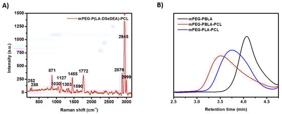Raman shift of mPEG-P(LA-DSeDEA)-PCL (A) and APC traces of block copolymers (B).