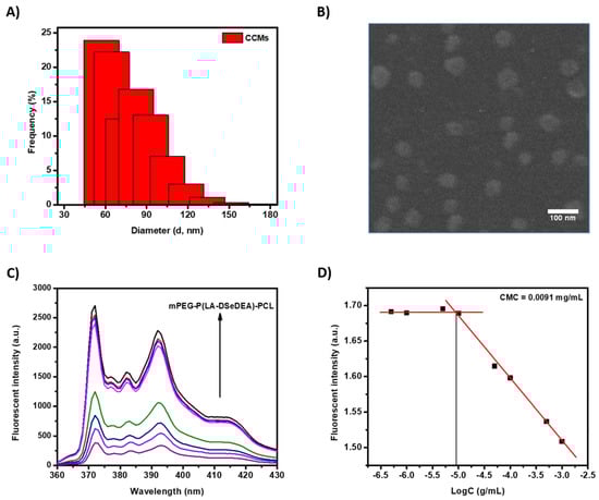Particle size distribution of CCMs (A), SEM image of CCMs (B), fluorescent emission spectra of pyrene at different concentrations of mPEG-P(LA-DSeDEA)-PCL (C) and its CMC value (D). The scale bar in the SEM image is 100 nm.