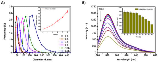 Particle size distribution of CCMs treated with 10 mM GSH (A); fluorescent emission spectra of RhB@CCMs treated with 10 mM GSH (B) for 72 h (n = 3). The inset in image A refers to the time dependent change in Dh and the inset in image B shows quantitative fluorescent detraction of RhB@CCMs in the presence of 10 mM GSH.