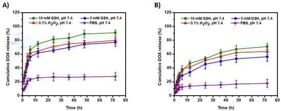 In vitro redox-responsive DOX releasing profile of DOX@NCMs (A) and DOX@CCMs (B) at 37 °C (n = 3).