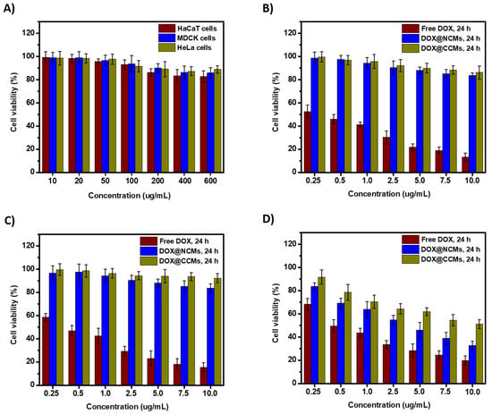 Cytotoxicity of mPEG-P(LA-DSeDEA)-PCL in HaCaT, MDCK, and HeLa cells (A); cell viability of free DOX, DOX@NCMs, and DOX@CCMs against HaCaT (B), MDCK (C), and HeLa (D) cells after 24 h (n = 3). The concentration of DOX@CCMs and DOX@NCMs refers to the equivalent free DOX concentration encapsulated in the micelles.