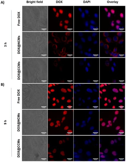 The cellular uptake and intracellular localization of DOX@NCMs and DOX@CCMs were investigated by a fluorescent microscope using cancer (HeLa) and normal (HaCaT) cells. Both cell lines were grown in Dulbecco’s modified Eagle medium (DMEM) supplemented with 10% fetal bovine serum (FBS), 1% penicillin, 1% glutamine, and 1% sodium pyruvate at 37 °C and 5% CO2. For cellular uptake experiments, fully grown HeLa and HaCaT were trypsinized and seeded into 35 mm glass-bottom culture dishes (MatTek Corporation) at a density of 2 × 105 cells/well in complete DMEM and maintained in a humidified incubator at 37 °C under 5% CO2 for 24 h. Then, 3 µg/mL of free DOX, DOX@NCMs, and DOX@CCMs (at equivalent DOX concentrations) were added to different treatment groups. After 3 and 9 h, cells were rinsed with PBS, stained with DAPI (300 nm) for 15 min, fixed with 4% paraformaldehyde solution, and the cellular uptake and localization of free DOX, DOX@NCMs, and DOX@CCMs were observed using a fluorescent microscope [3].