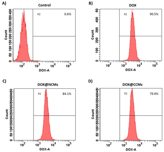 Flow cytometry analysis of HeLa cells treated with PBS (A), DOX (B), DOX@NCMs (C), and DOX@CCMs (D) for 9 h at 3 µg/mL of equivalent DOX concentration.