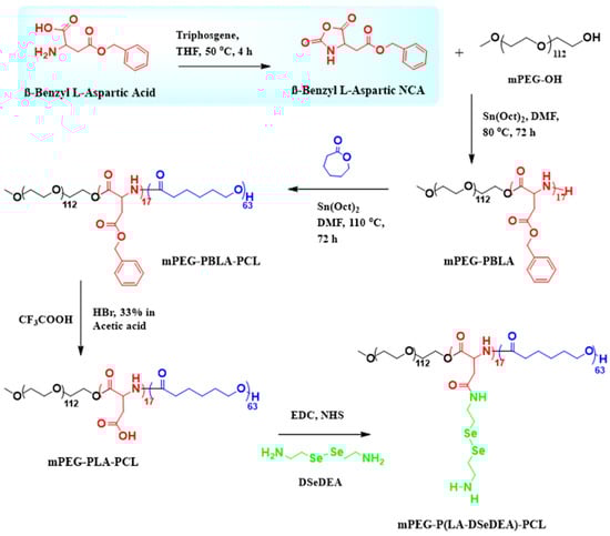 The synthesis of mPEG-P(LA-DSeDEA)-PCL with pendant Sec moiety was conducted by sequential ROP reaction of mPEG–OH with BLA-NCA and ε-caprolactone followed by hydrolysis of the benzyl ester group and subsequent coupling with selenocystamine dihydrochloride (DSeDEA) through EDC/NHS click chemistry (Scheme 1). The monomer, (BLA-NCA), was synthesized by the cyclization reaction between l-aspartic acid β-benzyl ester and triphosgene, as described in the Fuchs–Farthing method [39]. Briefly, l-aspartic acid β-benzyl ester (1 g, 4.5 mmol) was added to 15 mL of anhydrous THF. Then, 0.8 g (2.7 mmol) of triphosgene was added to the above suspension, heated at 50 °C in an oil bath and stirred in a nitrogen atmosphere for about 4 h. The resulting colorless mixture was concentrated (until 25% of the original volume remained), poured into excess cold anhydrous hexane and kept overnight at −20 °C. Finally, the precipitate was collected, dried under vacuum for 48 h, and stored at 4–10 °C until used for further reactions.
