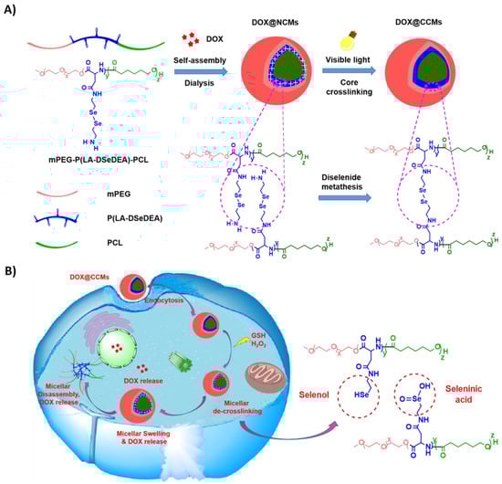 (A) Preparation of doxorubicin (DOX)-loaded mPEG-P(LA-DSeDEA)-PCL micelles and (B) mechanism of redox-responsive intracellular drug release from DOX@CCMs (DOX-loaded core crosslinked micelles).
