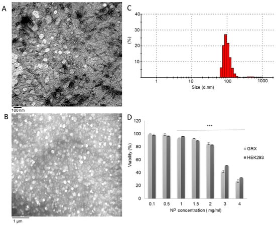 Figure 2. (A) Transmission electron microscopy and (B) scanning electron microscopy images obtained for chitosan nanoparticles (C) Hydrodynamic diameter distribution characterization by Dynamic Light Scattering. (D) The effect of chitosan nanoparticles (CS-NPs) on GRX and HEK293 cell viability, as determined by the MTT assay. The results are presented as the mean ± SD viability relative to untreated cells (n = 4). Statistical analysis was performed by GraphPad InStat software using a one-way analysis of variance test (ANOVA), where (***) p < 0.001.