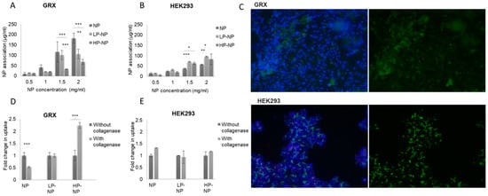 Figure 3. CS-NP association in GRX and in HEK293 cells as a function of NP peptide density and extracellular matrix (ECM )collagen density. CS-NP association in (A) GRX and (B) HEK293 cells results expressed as the mean ± SD concentration of NPs associated by the cells (n = 3). (C) Fluorescent microscopy studies of model oligo (MO)-loaded CS-NPs; when incubated for 24 h with GRX and HEK 293 cells, nuclei appear blue due to DAPI staining, whereas CS-NPs appear green. CS-NP association following pretreatment with collagenase in (D) GRX and (E) HEK293 cells; the results are expressed as the mean ± SD fold change in association as result of collagenase pre-treatment (n = 3). Statistical analysis was performed by GraphPad InStat software using a one-way analysis of variance test (ANOVA), where (*) p < 0.05, (**) p < 0.01 and (***) p < 0.001.