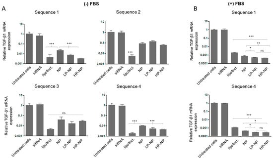 Figure 4. Transforming growth factor-beta (TGF-β1) gene silencing in GRX cells as determined by RT-qPCR (n = 3). Cells were treated with different sequences of TGF-β siRNA in free form (siRNA), transfected with Lipofectamine 2000 (lipofect.), encapsulated in unmodified NPs (NP), LP-NPs and HP-NPs in (A) serum-free cell culture medium and (B) medium supplemented with 10% fetal bovine serum (FBS). Statistical analysis was performed by GraphPad InStat software using a one-way analysis of variance test (ANOVA), where (*) p < 0.05, (**) p < 0.01 and (***) p < 0.001.