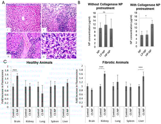 Figure 5B shows that, in fibrotic animals that did not receive collagenase-NPs to decrease collagen in the ECM, there was no difference in the extent of liver accumulation for the three NP formulations. Conversely, however, when animals were pre-treated with collagenase-NPs, the HP-NPs exhibited significantly higher accumulation in fibrotic livers as compared to unmodified NPs and LP-NPs. Interestingly, for both CS-NPs and LP-NPs, the extent of liver accumulation was reduced upon collagenase-NP pretreatment (approx. 1.7- and 1.9-fold respectively); this indicates that the digestion of ECM collagen reduces the NP accumulation, indicating that these NPs localize in the ECM as opposed to the aHSCs or even the Kupffer cells. Conversely, HP-NP accumulation increased upon collagenase-NP pretreatment, and, in cases such as those observed in the in-vitro association experiments, it could be concluded that these NPs do not accumulate in the liver as function of ECM matrix interaction or Kupffer cell sequestration but based on their interaction with the aHSCs. These conclusions are underpinned by the results of the in-vitro experiments where CS-NPs and LP-NPs did not show enhanced association in GRX cells upon collagenase pretreatment but HP-NPs showed a significant increase in association/uptake. This is in addition to the higher ability of HP-NPs to reduce TGF-β1 expression in GRX cells in comparison to unmodified and LP-NPs (Figure 4A). This is also confirmed by the results depicted in Figure 5C, which clearly indicate the change in CS-NPs biodistribution in fibrotic animals relative to healthy ones. In healthy animals, CS-NPs surprisingly accumulate in the brain. This is observed by the increase in fluorescence intensities obtained from CS-NPs receiving animals when compared to controls that have only received PBS. The accumulation of chitosan nanoparticles in the brain following IV administration has been reported previously [46,47]. In animals receiving IP CCl4, CS-NPs accumulate in kidneys and liver but not in the brain. Given that IP CCl4 injections have been reported to also result in kidney fibrosis [48,49] which is also characterized by excessive collagen deposition [50,51], it could therefore be implied that CS-NPs accumulate in organs of high collagen content. More importantly, based on the low NP accumulation in the spleen, which is also a major RES organ [52,53,54] and in the livers of healthy animals, the liver accumulation observed in fibrotic animals could not be mainly attributed to RES sequestration. The latter is underpinned by reports demonstrating that chitosan coating of NPs reduced their opsonization and phagocytosis [55,56]. Here, CS-NPs are also believed to accumulate as a function of chitosan–collagen interaction, and this further highlights the role of chitosan-collagen interaction in targeting of fibrotic diseases.