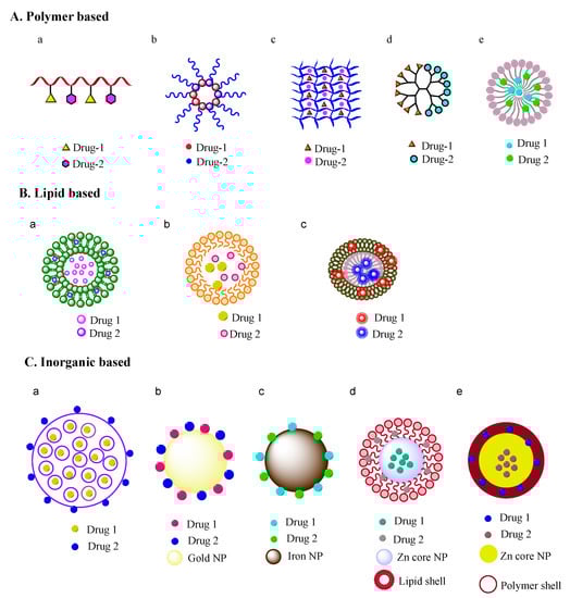 Nanoformulations for combination therapy. (A) polymer based nanoformulations: (a) polymer-drug conjugate, (b) micelle, (c) hydrogel, (d) dendrimer, (e) polymeric nanoparticle; (B) Lipid based nanoformulations: (a) liposome, (b) solid lipid nanoparticle, (c) nanocell; (C) Inorganic material based nanoformulations: (a) mesoporous silica particle, (b) gold nanoparticle, (c) iron nanoparticle, (d) lipid-core/shell nanoparticle, (e) polymer-core/shell nanoparticle. (NP denotes nanoparticle).