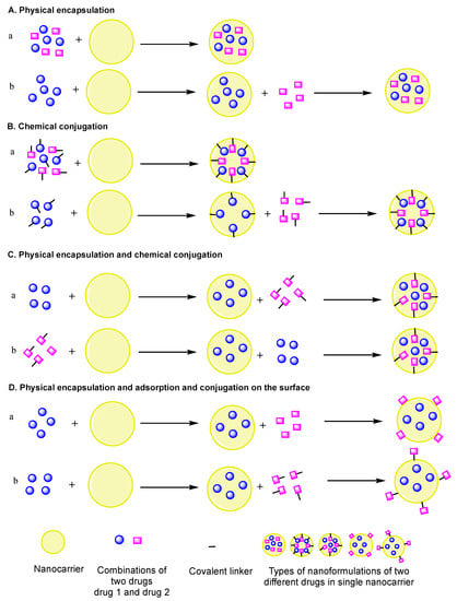 Pictorial representation of different approaches to implement two drugs in a single nanocarrier. (A) Physical encapsulation: (a) two different drugs physically encapsulated, (b) two different drugs physically encapsulated one after the other; (B) chemical conjugation: (a) two different drugs chemically conjugated, (b) two different drugs chemically conjugated one after the other; (C) physical and chemical conjugation of two different drugs one after the other: (a) drug1 physically encapsulated and drug2 chemically conjugated, (b) drug1 chemically conjugated and drug2 physically encapsulated; (D) physical encapsulation and adsorption and conjugation on the surface: (a) drug1 physically encapsulated and drug2 absorbed on the surface, (b) drug1 physically encapsulated and drug2 chemically conjugated on the surface.