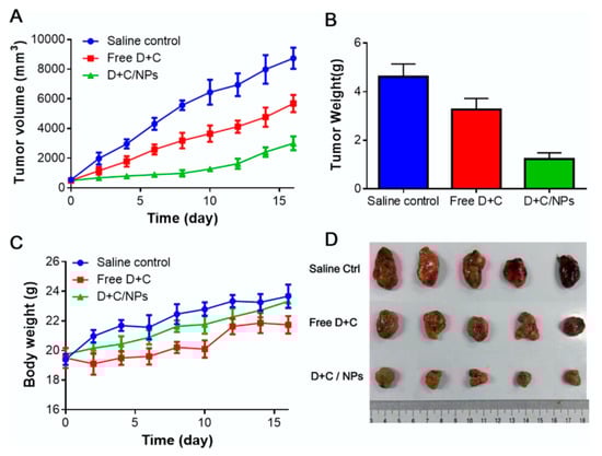 Antitumor effect of pH-sensitive polymeric nanoparticles of co-loaded Dox and Cur in hepatocellular carcinoma: (A) Tumor volume, (B) tumor weight, (C) body weight at the end of the experiment, (D) picture of excised tumors at the end of the experiment [80]. Reprinted with permission from ref. [80], copyright (2017) Elsevier.