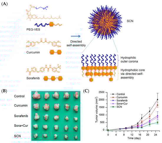 Self-assembled nanoparticles (SCNs) for the co-delivery of sorafenib and curcumin enhance their therapeutic effect in hepatocellular carcinoma: (A) schematic representation of SCNs, (B) tumor tissues from each group, (C) tumor growth profile [81]. Reprinted with permission from ref. [81], copyright (2015) American Chemical Society.