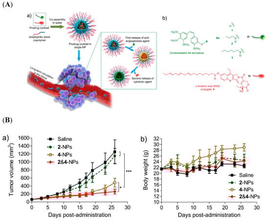 (A) (a) Schematic illustration of self-assembled nanoparticles of block copolymers and prodrugs of CA4 derivatives (2 and 3) and linolenic acid-7-ethyl- 10-hydroxycamptothecin (SN38) conjugates; (b) chemical structures of CA4 and its ester derivatives 2 and 3 and derivatives of SN38. (B) Mice bearing subcutaneous HT-29 tumors were intravenously treated with different drug-loaded nanoformulations three successive times: (a) change in tumor, (b), body weight change [82]. Reprinted with permission from ref. [82], copyright (2017) American Chemical Society. * p < 0.05, *** p < 0.001.