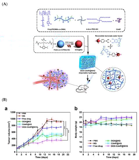 (A) Chemical scheme and schematic representation of nanohydrogel for the sequential local delivery of CA4P and Dox, (B) (a) tumor volumes in tumor regression study of hepatocellular carcinoma (HCC) (tumor-bearing mice), (b) tumor body weight changes [83]. Reprinted with permission from ref. [83], copyright (2018) American Chemical Society. *** p < 0.001.