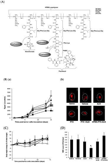 (A) Chemical structure of N-(2-Hydroxypropyl)methacrylamide (HPMA) copolymer- paclitaxel (PTX)-alendronate (ALN) conjugate and the release of the drugs PTX and ALN by cathepsin B; (B) conjugate inhibits 4T1-mCherry mammary adenocarcinoma in the tibia, (a) antitumor efficacy measured by intravital noninvasive fluorescence imaging, (b) fluorescence images; (C) body weight change (presented as % change from initial weight); (D) White blood cells (WBC) counts from blood samples collected on day 11. Data represent mean (SEM of six mice per group. * p < 0.05 value of mice treated with HPMA copolymer-PTX-ALN conjugate was analyzed against saline control mice. * p < 0.05 value of free PTX or combination of free PTX plus ALN was analyzed against control mice treated with PTX vehicle. [86]. Reprinted with permission from ref. [86], copyright (2011) American Chemical Society.