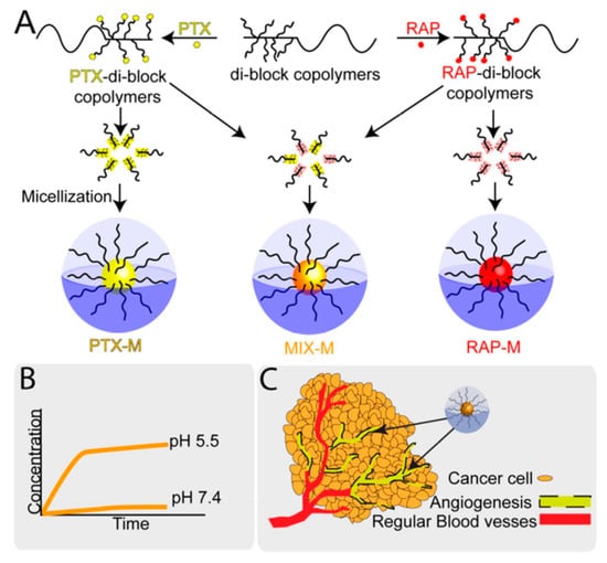 Pictorial representation of individual and mixed micelle polymer-conjugates of paclitaxel (PTX) and rapamycin (RAP): (A) synthesis schematic for polymeric-paclitaxel conjugate and polymeric-rapamycin conjugate and their micelles formulation, (B) pH-dependent drug release from micelles, (C) accessibility and accumulation of micelles for human umbilical vein endothelial cells HUVECs and cancer cells (ovarian) in the tumor environment [87]. Reprinted with permission from ref. [87], copyright (2016) American Chemical Society.
