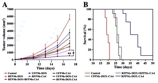 Yiguang Wang et al. synthesized arginine-glycine-aspartic acid (RGD)-functionalized polymeric micelles of poly(ethylene glycol)-b-poly(d,l-lactide) (PEG-PLA). Here, Dox and CA4 were encapsulated into micelles (namely, RFPMs-DOX-CA4) of 29.2 ± 2.5 nm size. These micelles (RFPMs-DOX-CA4) was demonstrated to sequentially release both drugs, resulting in the sequential killing of endothelial cells and tumor cells in vitro. In addition, these micelles were reported to exhibit a greater tumor growth inhibition and higher survival rate in comparison to free drugs and their combination in B16-F10 tumor-bearing mice. Further, the in vivo evaluation of these micelles showed a significant reduction in the tumor vasculature and cell proliferation, which suggests these micelles can be effective for combination cancer therapy (Figure 10) [88].