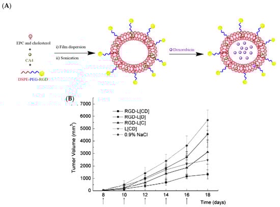 Yi-Fei Zhang et al. developed an arginine–glycine–aspartic acid (RGD)-modified liposome, co-encapsulating Dox and CA4 with the aim of assessing sequential release and enhancing tumor inhibition responses. The results showed that the release rate of Dox was much slower than that of CA4 in vitro. The intracellular uptake of liposomal drugs by B16/B16F10 melanoma tumor cells and human umbilical vein endothelial cells (HUVECs) was enhanced based on flow cytometry and laser confocal scanning microscopy assessments. A cytotoxicity assay demonstrated the lower half maximal inhibitory concentration (IC50) of RGD-modified liposomes than the corresponding unmodified liposomes. Prominent synergistic effects on tumor reduction were observed with RGD-modified liposomes co-encapsulating CA4 and Dox, delineating the importance of a targeted drug delivery system for the co-encapsulation of antiangiogenic and anticancer agents for cancer treatment (Figure 11) [91].