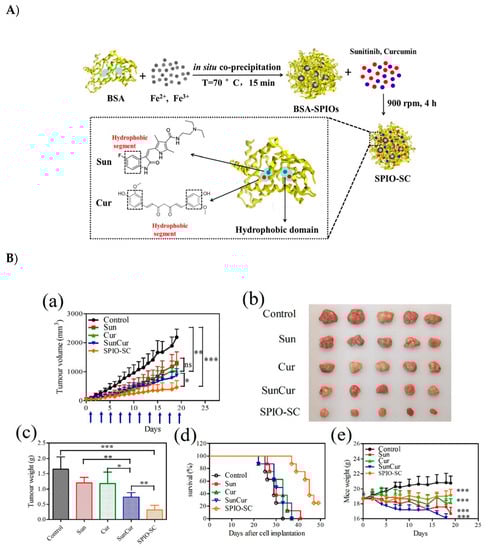 (A) Schematic representation of bovine serum albumin-coated superparamagnetic iron oxide (BSA-SPIO) nanoparticles further co-loaded with two drugs (Sun and Cur) to achieve combined cancer therapy. (B) antitumor activity of BSA-SPIOs and drug-loaded BSA-SPIOs in an MCF-7 tumor xenograft mouse model. The mice were treated with free Sun, free Cur, free Sun + Cur, and SPIO-SC every other day by tail vein injection at doses of 15 mg/kg for sun and 30 mg/kg for cur. (a) The growth of tumor volumes, (d) Nude mouse survival time of each group; (e) Nude mouse weight of each group [92]. Reprinted with permission from ref. [92] copyright (2017) Royal Society of Chemistry. * p < 0.05, ** p < 0.01, *** p < 0.001.