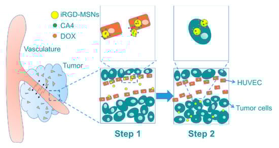 Pictorial representation of CA4 and Dox-loaded mesoporous silica nanoparticles (MSNs) targeted with 9-amino acid (CRGDKGPDC) cyclic (iRGD) peptide delivery in tumors. Step 1: CA4 is first released at tumor vasculature with the help of targeting ligands (iRGD peptides); subsequently, in step 2 this nanoformulation is endocytosed into acidic tumor cells where most of the Dox is released [93]. Reprinted with permission from ref. [93], copyright (2016) Dove press.