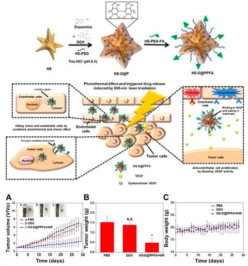 Schematic representation of the synthesis of polydopamine (PDA)-coated gold (Au) nanostar (NS@PPFA) for combined anticancer and antiangiogenic treatment: antitumor activity of polydopamine (PDA)-coated gold (Au)-Dox nanostar (NS-D@PPFA) in MCF-7/Adriamycin (ADR) tumor-bearing mice. (A) Tumor growth curve of mice receiving intravenously administration of PBS, Dox (5 mg/kg), and NS-D@PPFA (6 mg/kg Au; 1.8 mg/kg Dox) at day 0 and day 14, respectively. Tumors were treated with NIR irradiation (0.9 W/cm2, 3 min, 3 times) at 24 h and 48 h after each injection. (B) Tumor weight was measured on excised tumors at day 28 after different treatments. (C) Body weight monitoring of the treated mice over a period of 28 days [94]. Reprinted with permission from ref. [94]. * p < 0.05, N.S.: not significant.