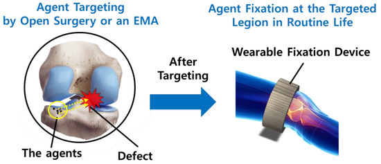 Recently, magnetically controllable therapeutic agent carriers (MCTACs) have emerged as a suitable candidate facilitating the development of precisely targeted drug delivery systems. As MCTACs contain magnetic nanoparticles (MNPs), they can be controlled and directed to a target lesion by means of external permanent magnets or electromagnetic actuation system (EMA) [1,2,3,4]. Owing to the advantages of minimally invasive surgery and accompanied by a strong targeting ability and reduced side effects, MCTACs have been highlighted for their precise therapeutic delivery, particularly in terms of cell-based therapeutics and triggered drug releases [5]. Furthermore, most of the previous research pertaining to MCTACs has focused on the targeting mechanism and its clinical efficacy. However, the fixation of MCTACs at targeted lesions after precise delivery has not been addressed thus far. Considering the cell proliferation period, a fixation mechanism suitable for routine life after the procedure at the clinical site is essential to ensure effective therapeutics. With regard to this, we propose a novel wearable fixation mechanism and its application to an MCTAC designed for cartilage repair stem cell therapeutics, as shown in Figure 1.