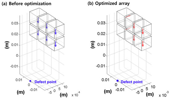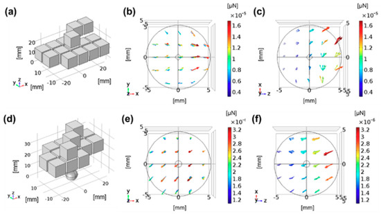 Figure 5 shows the resultant array configuration comprising six permanent magnets, and the direction of each permanent magnet was determined to produce an enhanced pulling force at the target lesion. The figure on the left presents the initial seed configuration for the univariate optimization, and the figure on the right depicts the resultant configuration obtained through computation. In the resulting configuration, it is evident that each magnet is arranged along different directions to enhance the magnetic force at the defect lesion, while using the same six permanent magnets. The results of comparing the magnetic fields of the resultant configuration and the initial seed configuration are presented in Figure 6; the figure also indicates the enhanced magnetic flux density and gradient field. The magnetic flux density is improved by approximately 16.03%, and the gradient field is enhanced by approximately 23.61% in the ROI. Moreover, the magnetic flux density of the proposed design can produce fields exceeding 40 mT at a distance of 16 mm, which is the minimum required field strength, as reported by previous research [12,13].