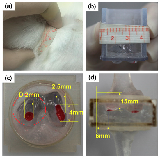 Figure 4 shows the actual dimensions of the animal subject knee, and the phantom model mimicking the cartilage of the subject animal. As the geometric parameters are dominant factors for the appropriate optimization and design required for the fabrication of the subject-specific wearable fixation device, we measure the actual target geometric parameters from the animal subject. As shown in Figure 4a,b, the circumference and width of the knee are measured to fabricate the 3D phantom. The artificial defect position and device wearing position are subsequently designed, as shown in Figure 4c,d. The defects are created close to the designed position on the animal cartilage, and the wearable device is wrapped over the upper part of the knee during the in-vivo experiments.