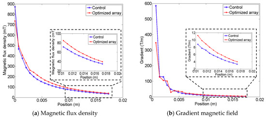 Comparison of magnetic flux density and gradient magnetic field for the initial magnetic array and the optimized magnetic array. The blue line indicates the initial configuration, and the red line represents the optimized array. (a) Magnetic flux density. (b) Gradient magnetic field.
