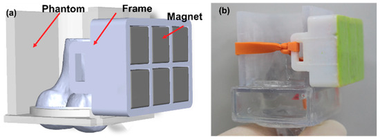 The final design and prototype of the wearable fixation device are shown in Figure 7. The device consists of the optimized array with six permanent magnets, a soft frame to assemble the magnets, and a band to attach it to the knee. The device can be wrapped over the upper part of the knee, as shown in Figure 7b.