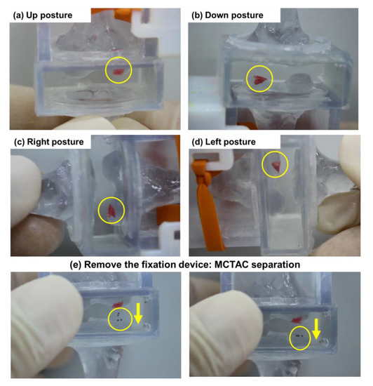 Figure 8a–d present the results of the fixation capability with respect to different postures of the cartilage, which simulate routine changes in the posture of the knee, and the therapeutic agents were positioned at the defect marked in red. The spheroids were immobilized at the defect site when the phantom model changed its posture in any direction from 0 to 360°. Additionally, we could observe that, even with the dynamic motion and slight shaking caused by assuming extreme movements, the spheroid remained fixed at the defect by means of the fixation device. However, when the fixation device was removed from the phantom model, the targeted spheroids dropped from the targeted lesion, as shown in Figure 8e. Through these in-vitro experiments, we could confirm that the proposed fixation device was capable of fixing MCTACs at the targeted lesion in a stable manner, even in the presence of routine movements.