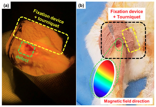 In-vivo experimental setup, where the fixation device is wrapped around the upper part of the knee of the animal subject: (a) fixation device secured on the rabbit using a tourniquet and (b) magnetic field at the defect due to the fixation device.