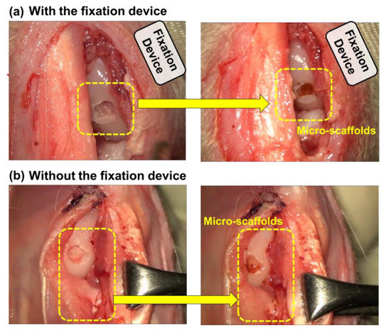 Furthermore, the strong fixation force offered by the device was also verified through several experiments. After injecting the micro-scaffold, we injected PBS solution via a disposable syringe to produce a flow similar to bleeding in the fixation area, and this flow intentionally washes out the micro-scaffolds. The results indicate that, even under this extreme condition, the micro-scaffolds remain fixed at the defect lesion by means of the fixation device. However, in the absence of the fixation device, the micro-scaffolds fail to remain attached at the defect lesion.