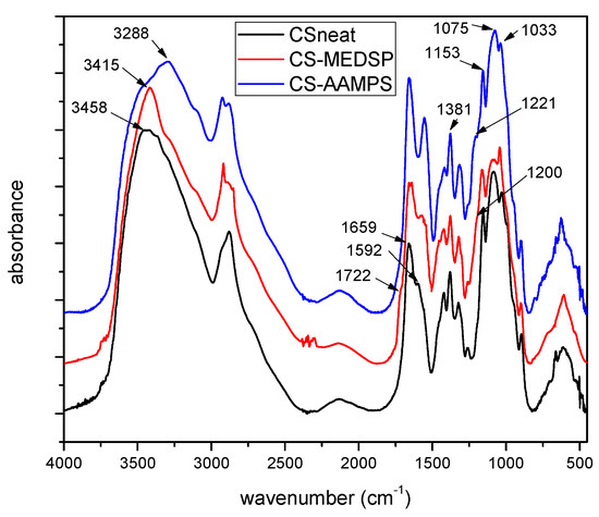 FT-IR spectra of neat CS and its derivatives with AAMPS and MEDSP.