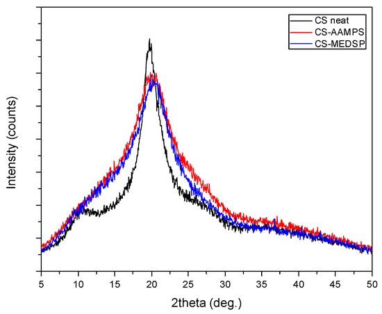 CS is a semi-crystalline polymer, as all polysaccharides, due to the strong hydrogen bonds between its hydroxyl groups, as well as the ones between the amino and hydroxyl groups. This was proved by the obtained XRD patterns where neat CS recorded two broad halo peaks at 2θ = 10.5 and 19.8°. As can be seen in Figure 2, the prepared CS-AAMPS and CS-MEDSP grafted derivatives are also semi-crystalline since a strong peak at 20.3° was recorded in their patterns. Both AAMPS and MEDSP monomers are crystalline materials. However, it becomes evident that the degree of crystallinity was reduced, since the intensity of the recorded peak at 20.3° is lower than that of neat CS peak and the curve is also broadened. Furthermore, the low intensity peak at 10.5° was not recorded in derivatives. The introduction of side groups in CS’s macromolecular chains is well known that reduces their ability to fold and create crystallites, thus producing less crystalline [55,56] or completely amorphous derivatives [50]. This also occurs in the case of the produced CS-AAMPS and CS-MEDSP derivatives.
