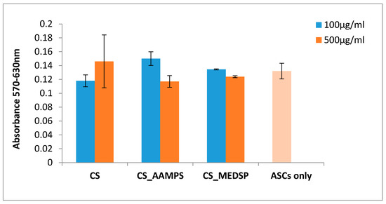 CS is a biocompatible polymer and can be used in biomedical and pharmaceutical applications. However, since there are no existing toxicity tests for these particular prepared derivatives, an MTT test was performed to ensure that they are safe to use for drug nanoencapsulation and ocular applications. In Figure 3, the Y’Y axis’ values represent the reduction of yellow 3-(4,5-dimethythiazol2-yl)-2,5-diphenyl tetrazolium bromide (MTT) by mitochondrial succinate dehydrogenase. The MTT enters the cells and passes into the mitochondria, where it is reduced to formazan product. The cells are then solubilized with an organic solvent and the released, solubilized formazan reagent is measured spectrophotometrically. Since the reduction of MTT can only occur in metabolically active cells, the level of activity is a measure of the viability of the cells. A concentration of 100 or 500 mg/L of each polymer was used, and, as can be seen in Figure 3, both derivatives have similar absorbances with neat CS, indicating that these are biocompatible materials with low toxicity [57,58]. In all cases, the recorded values are very close to that of the reference sample where no material was added on the ASCs. Similar results have been found also from our group for other CS derivatives containing acrylates, such as poly(2-hydroxyethyl methacrylate) (PHEMA) [59] and 2-hydroxyethylacrylate [49], while the biocompatibility of CS-MEDSP derivative was also proved in a previous study reported in literature [50].