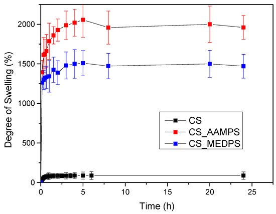 As can be observed in Figure 4, chitosan reached its maximum swelling degree in the first hour with a value of 70% at pH = 7 and no further swelling was detected up to 24 h. CS-MEDPS showed a maximum swelling at 5 h, which was estimated at about 1530%, followed by a slow decrease to 1475% in 8 h and then remained almost stable up until 24 h (1469%). Comparable were the results for CS-AAMPS, which reached a maximum swelling value up to 2055% in 5 h, followed by a minor reduction to 1965% after 8 h and then remained stable. It is clearly indicated that both prepared derivatives are more hydrophilic than neat CS, which could be attributed to the additional reactive groups that have been added onto the CS backbone. This is in well agreement with our previous studies in CS derivatives with N-(2-carboxybenzyl)chitosan, which, due to its hydrophilic character because of the added –COOH groups, exhibited a higher degree of swelling than neat CS [75]. Moreover, in acrylic acid/polyethylene glycol composites, it was found that by increasing the acrylic acid content, the swelling degree increases too [76].