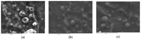 Scanning electron microscopy (SEM) micrographs of prepared nanoparticles were performed with an electron microscope (JMS-840, Peabody, MA, USA). The freeze-dried samples were covered with carbon coating in order to avoid charging under the electron beam. The operating conditions were the following: accelerating voltage 20 kV, probe current 45 nA, and counting time 60 s.